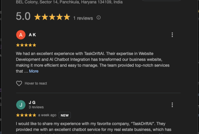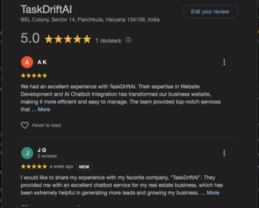 We had an excellent experience with TaskDriftAI. Their expertise in Website Development and AI Chatbot Integration has transformed our business website, making it more efficient and easy to manage. The team provided top-notch services that helped us scale our business seamlessly. I highly recommend TaskDriftAI to anyone looking for reliable and innovative digital solutions. Thank you once again for your outstanding support!